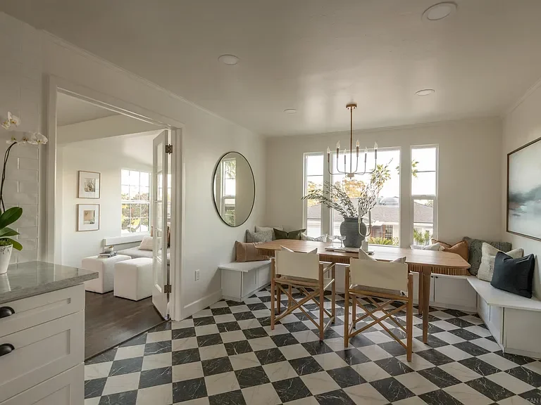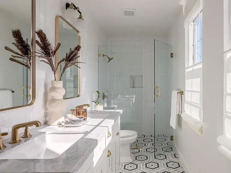 This 100-year-old Craftsman was my first transformation and a home filled with original charm—crystal doorknobs, crown molding, and untouched hardwood floors. I aimed to preserve its historic soul while introducing a refreshed perspective inspired by the Great Gatsby era. Black-and-white diagonal flooring, Carrara marble, and crystal hardware created a timeless blend of old-world character and modern livability.